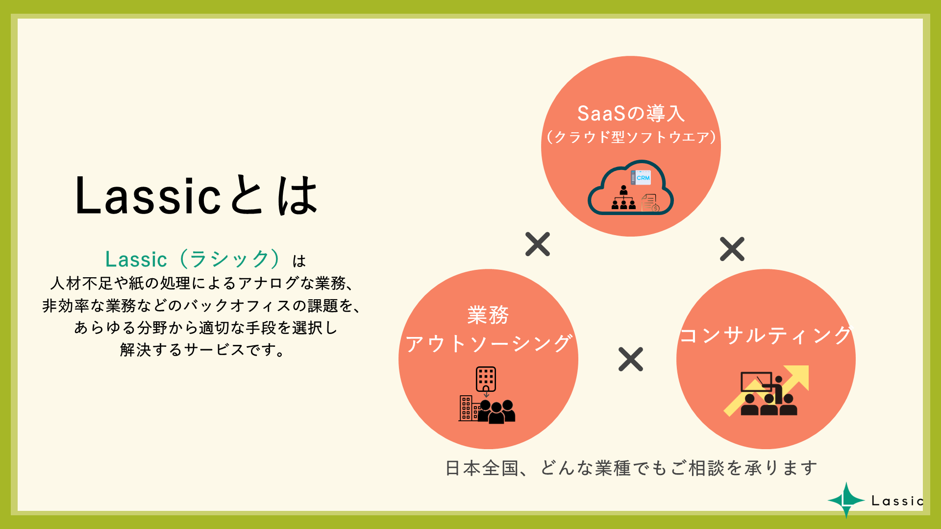 人事労務を始めとするバックオフィスのサポートを得意としている当社は、多くの企業の力になりたいと考え、バックオフィス課題解決サービス「Lassic(ラシック)」をリリースいたしました。