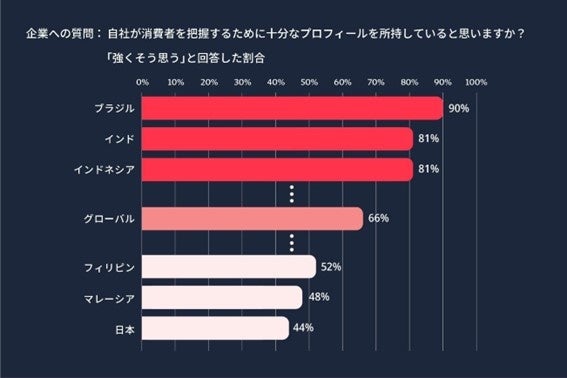 ただし、AIを導入する企業は増えている中で、大半の企業は消費者のデータの活用や獲得に苦労していることも明らかになっています。自社が消費者のことを把握するために十分なデータを所持していると強く同意する企業はグローバルでわずか16%でした。消費者の幅広いプロフィールを所持していることについて、「強くそう思う」「ある程度そう思う」とした企業は、グローバルでは66%でしたが、日本では調査国内最低の44%となっており、特にユーザー情報の収集に苦労していると推定されます。