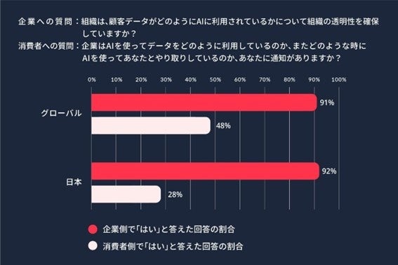 また、企業に対して、消費者の情報をAIに使用していることについて通知している (透明性がある) かを質問したところ、91%が「透明性が高い」と述べていました。しかし、消費者側に「AIを使ってコミュニケーションを取り、あなたの情報をAIに活用していることを企業から情報提供されていますか」と質問したところ、同意した回答は48%に留まりました。特に日本ではこの情報のギャップが大きく、透明性があると考えた企業側の回答は92%だったにも関わらず、消費者側でこの質問に同意した企業は28%にとどまっており、企業側と消費者の情報のギャップが特に大きいことが明らかになりました。