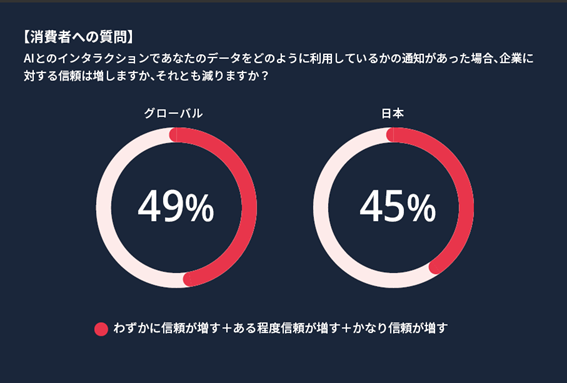 企業はAIを活用して顧客とのパーソナライズされたエンゲージメントを促進するために、各顧客のクリック、共有、フォロー、いいね、購入に関する情報を収集し、好みやニーズを把握しています。今年のレポートでは、消費者のほぼ半数(49%)が、AIを活用したコミュニケーションにおいて顧客データがどのように使用されるかを開示していれば、ブランドをより信頼すると回答しています(日本:45%)。