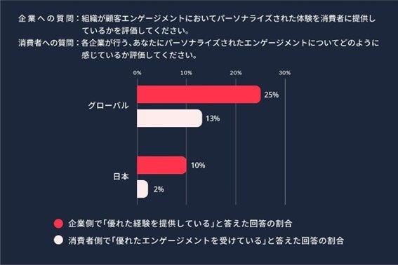 パーソナライズされたエンゲージメントについては、消費者と企業の間に大きなギャップがあることも明らかになりました。84%の企業が、「優れた」または「良い」とされるパーソナライズされた顧客エンゲージメント体験を提供していると回答していますが、それに同意している消費者はわずか54%です。日本では、企業側で「優れた」パーソナライズされた体験を提供していると回答した企業は10%に留まっていますが、消費者側でそれに同意したのはさらに少ない2%のみになっており、低いながらも世界の傾向と同様にギャップが出ました。
