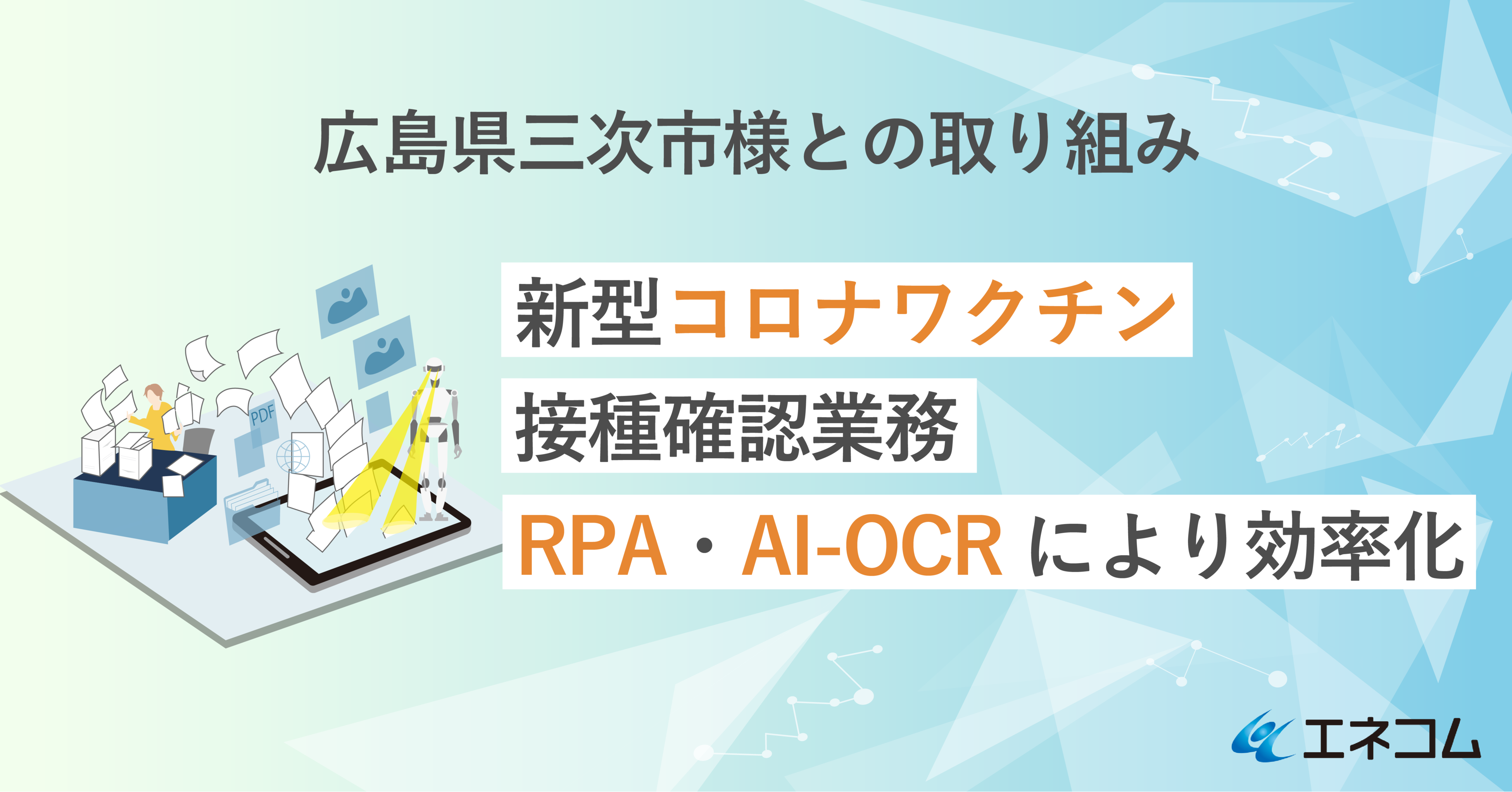 株式会社エネルギア・コミュニケーションズ(略称:エネコム、本社:広島県広島市、取締役社長:渡部 伸夫)は、広島県三次市(市長:福岡 誠志、以下:三次市)様の新型コロナワクチン接種記録確認業務へ、AI-OCRサービス「Seisho(注1)」とRPAサービス「EneRobo(注2)」を導入し、紙帳票の読取り・データ突合等の自動化を行い、想定される作業時間を約8割削減しました。