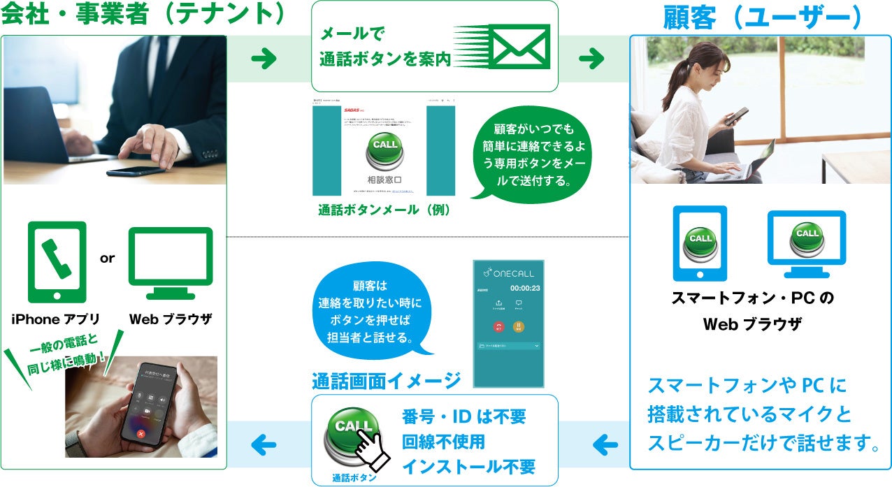 「ONECALL」は電話回線を使わずにWeb通話で相手(客)から自分(運営)宛に連絡をしてもらうという、