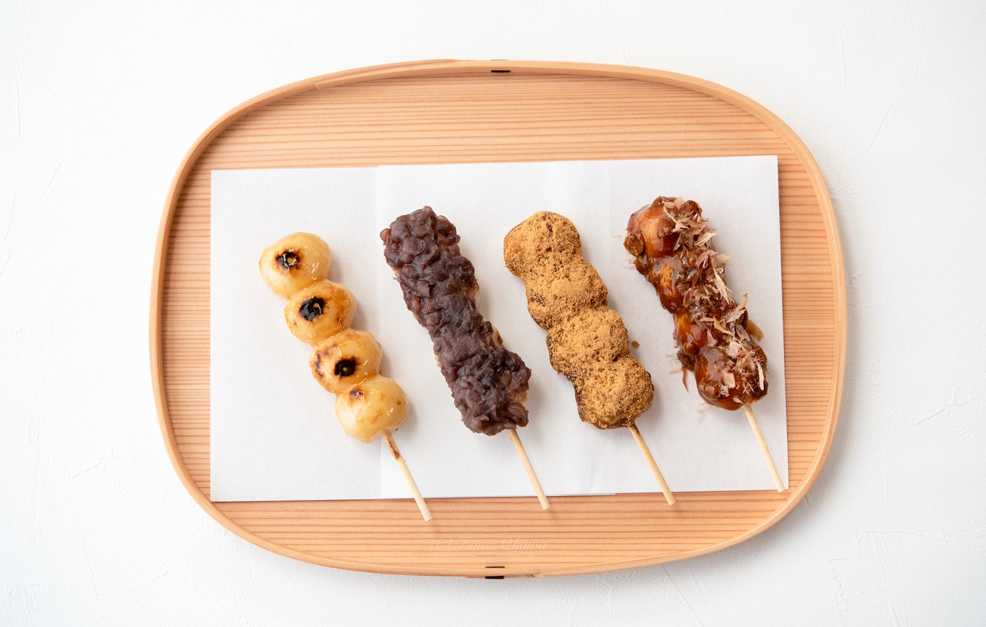 タレは、定番の「みたらし」(195円税込)の他、濃厚な小豆の風味がする丸三老舗自慢の「つぶあん」(195円税込)、波照間島の黒糖ダレに国産の香ばしいきな粉をたっぷりかけた「黒蜜きなこ」(195円税込)、千葉県銚子にて古来より伝わる伝統の発酵調味料「ひ志お」(216円税込)の4種で提供いたします。