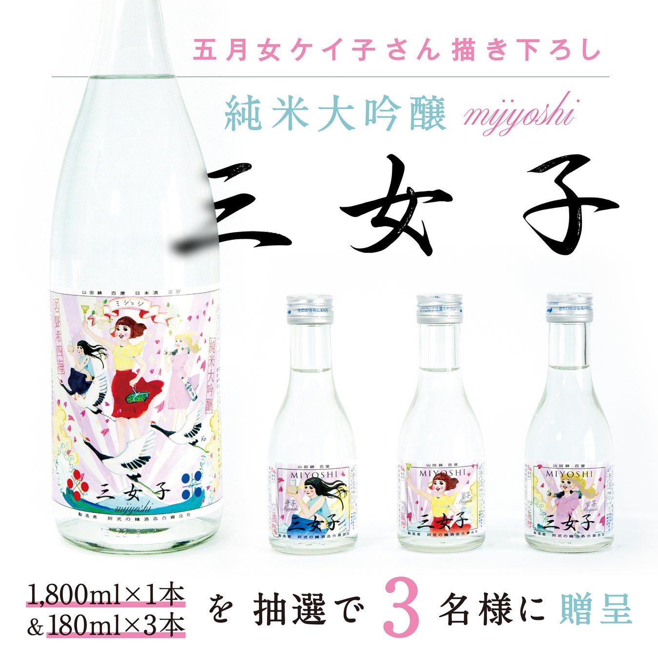 - 賞品 純米大吟醸「三女子」1,800㎖1本+180㎖(旨口・辛口・甘口)3本 計4本を抽選で3名様に贈呈