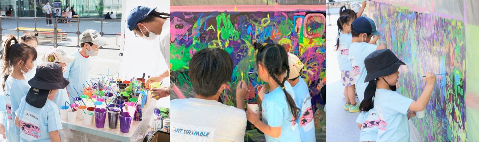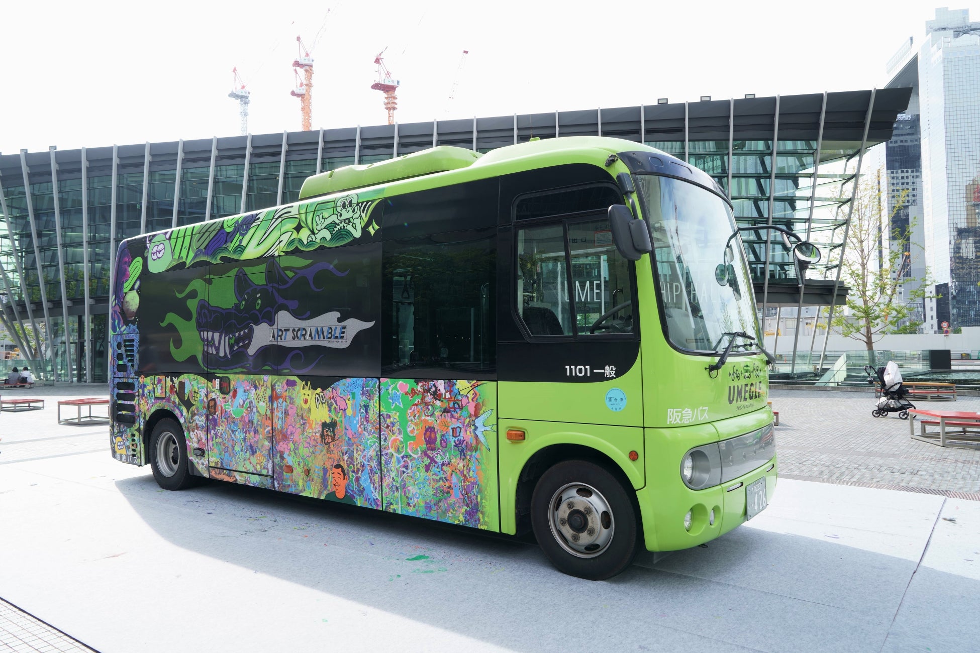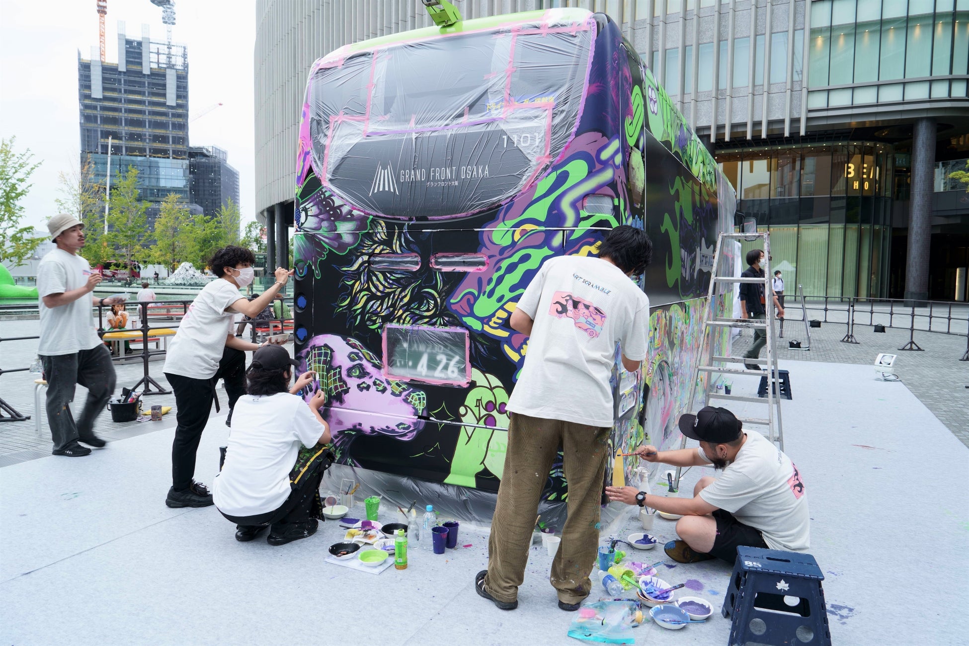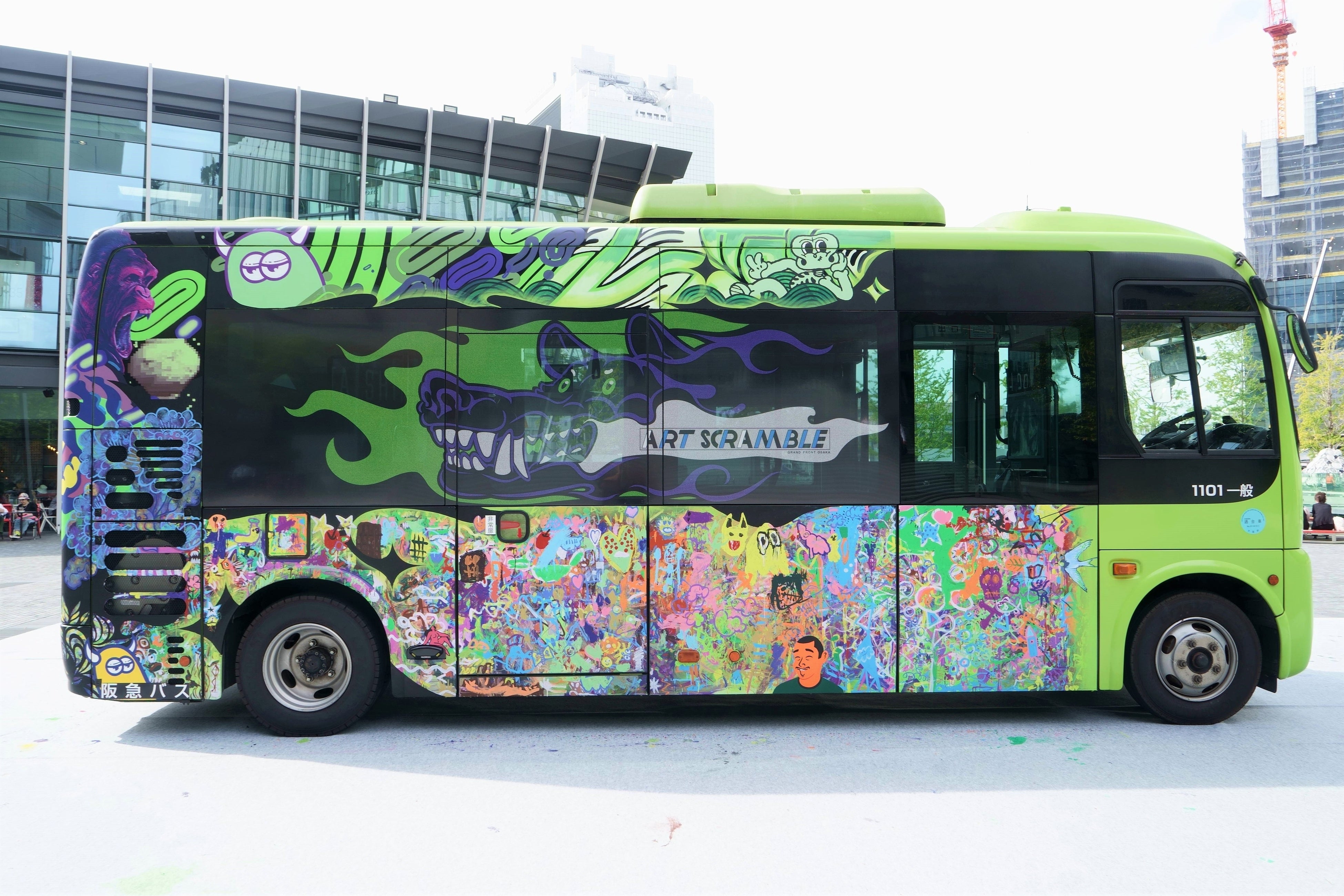 まずは、梅田エリア巡回バス「うめぐるバス」の車体にペイントを施した『うめぐるARTバス』。本作品は、キュレーターであるMon Koutaro Ooyama含め総勢23名のアーティストと、10月1日(土)・2日(日)に実施したワークショップに参加した50名の子どもたちによって制作されました。アーティストと子どもたちのエネルギー溢れる「走るアート作品」として、10月5日(水)から12月下旬頃まで、梅田のまちを巡回します。なお、子どもたちにアートの楽しさ・表現することの楽しさを感じてもらう取り組みとしてお子様向けのワークショップを今回初開催しましたが、グランフロント大阪では、子どもたちの夢を育む取り組みを今後も実施して参ります。