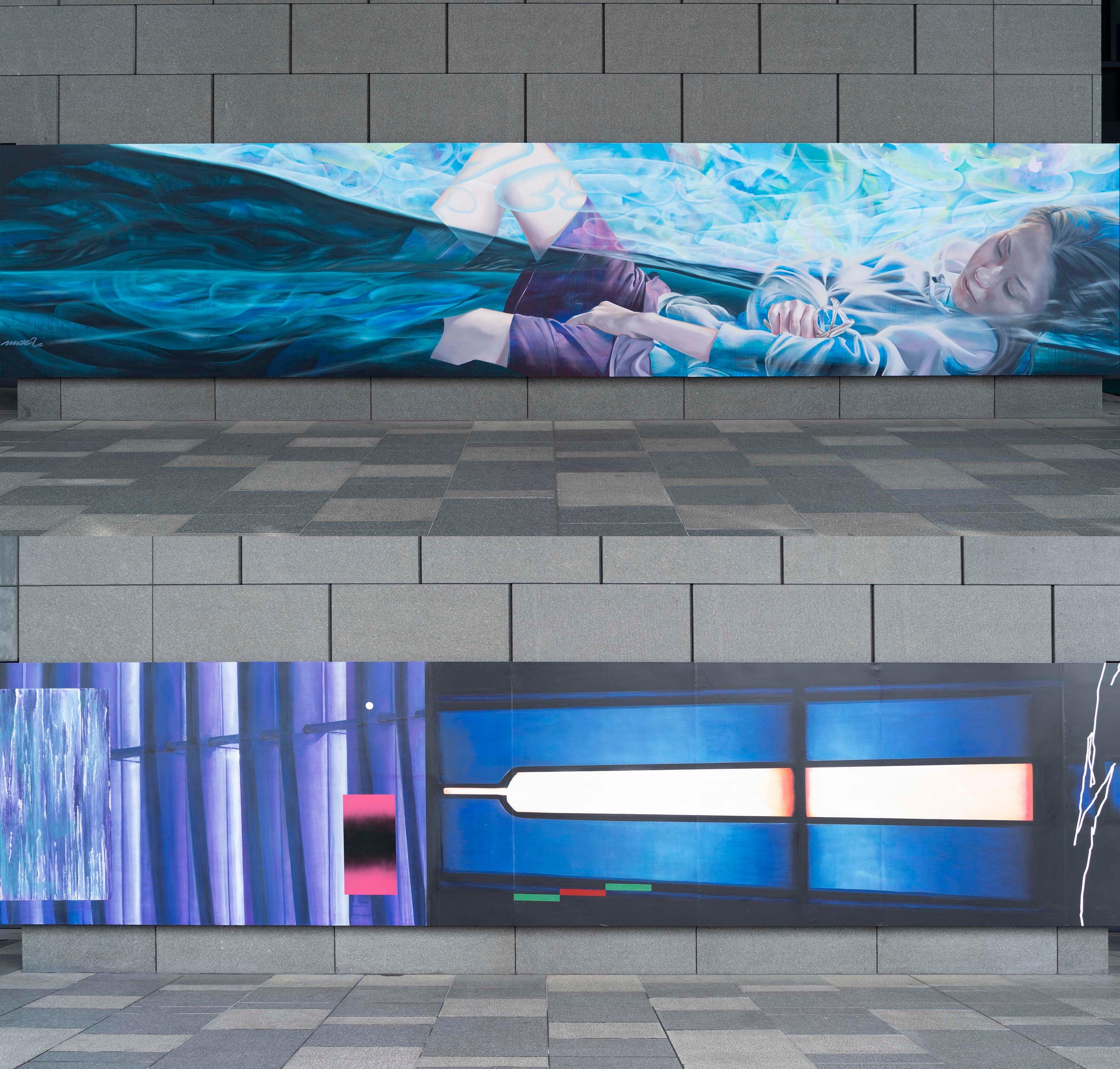 作品説明:メキシコ・ロスカボスの海面をモブラ(イトマキエイ)が大群で跳ね、海と空の両方を飛ぶように泳ぐ映像を観ました。海と陸の境界はそれぞれの世界で生きる生き物にとっての分水嶺であり、生と死がスイッチする境界線です。映像ではそのボーダーを彼らがスイスイとたやすく越境しているようで、今の時勢もあってか新鮮に映り、今回の壁画の着想になりました。境界線のアチラもコチラもどこ吹く風、寝仏のように昼寝に堕ちる女性をモチーフに、リラックスして構える大切さを描きとめようと描いた作品です。