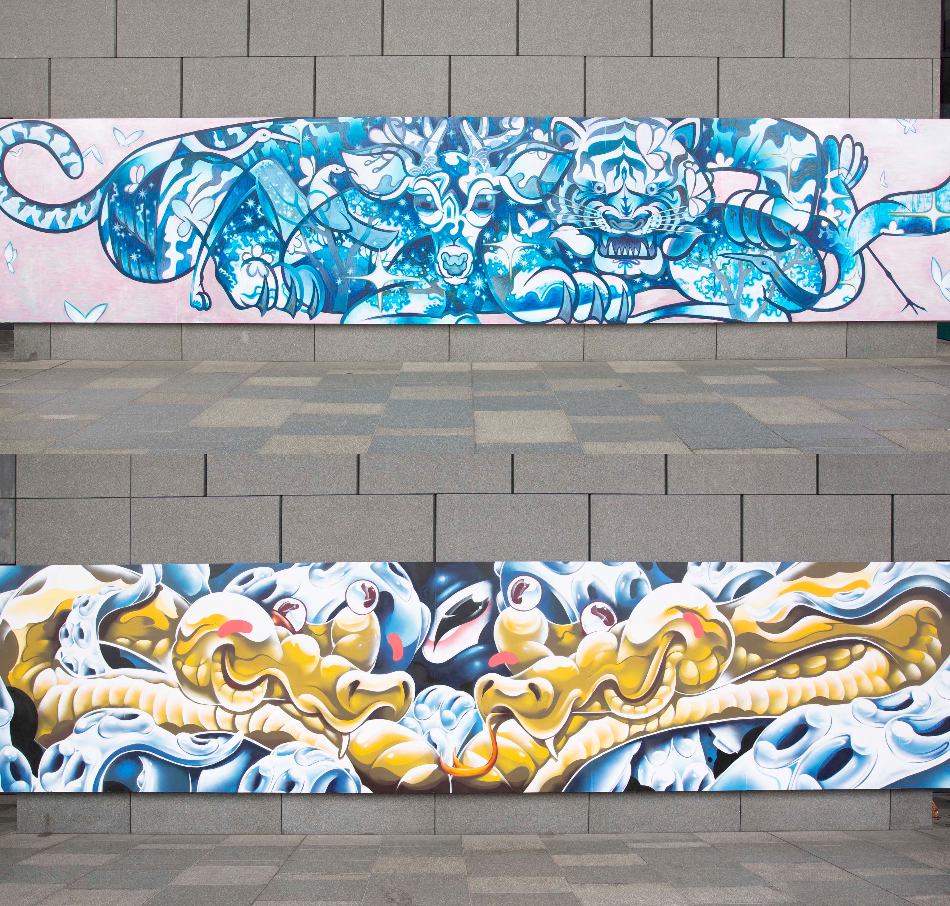 作品説明:コロナの猛威によって、あらためて私たちの経済圏は大自然の 中にあった事を強く思い知らされました。局地的に深刻な被害をもたらす地 震や津波、台風や火事よりも広範囲に、ウィルスは影響を与えます。飛行 機などの交通網が世界を覆う快適さに伴って、ウィルスはあらゆる都市に蔓 延できる可能性を手に入れたのでしょう。 自然の生態系を記号化したこのウォールアートは、動植物が自然環境と重 なり合って、一体となって、強かに生き抜く姿を示しています。微生物やウィ ルスを内包しながら、あらゆる生き物たちが関係し合った全体から、私たちが 学ぶことはとても沢山あります。 都市部にあっても、本当は自然の中にある私たちの生活が、こうした時代に 合わせて変化し、修正し、より良い世界に繋がっていきますように。