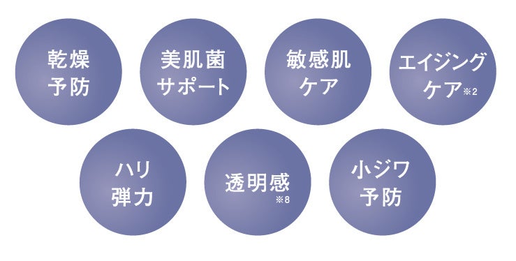 肌に備わる「美肌菌」に着目し、「美肌へ整えるスキンケア」+「美肌菌の成長と働きをサポートする成分」+「(乳酸桿菌/酵母菌による)発酵由来成分4種(※7)」による「スキンズケア」は、バイオ技術を惜しみなく搭載し、肌本来の潤いと肌ダメージ修復機能を高めることを目指した3アイテムです。肌表面の美肌菌をサポートし、角質層のすみずみへうるおいを届け、みずみずしくふっくらハリのある健康的な美肌へ導きます。さらに、しっとりながらもベタつきのないテクスチャで使い心地抜群です。