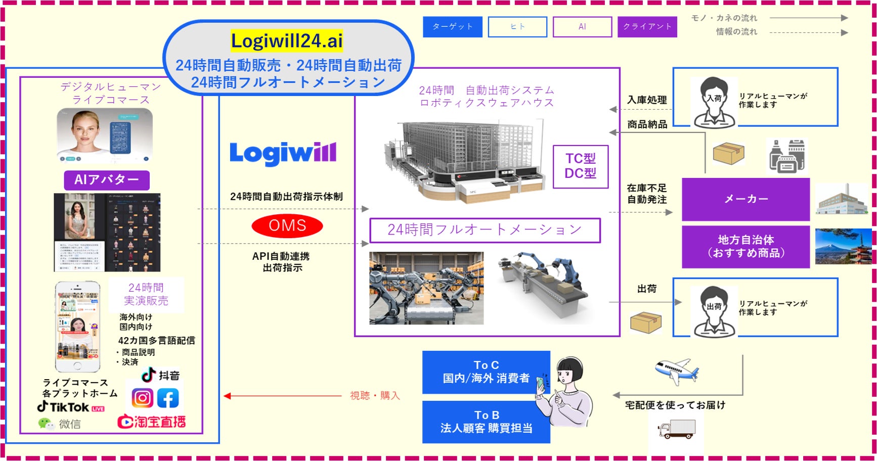 『Logiwill24.ai』:デジタルヒューマン(販売の自動化)とロボティクス物流(倉庫の自動化)を統合した、ライブコマース&ロボティクス・ロジスティクスサービス基盤(プラットフォーム)は、その先駆けとなる取り組みです。今後もIoT(センシング)技術やメタバースとの融合とコマース構想(みらいのコマース環境)や仮想化技術(AR/VR/XR/SR/3Dソリューション)等を進化・発展し生活者のLife Styleの環境変化に対応できるCX(体験価値)の向上に適応したサービス創出に取り組んで参ります。