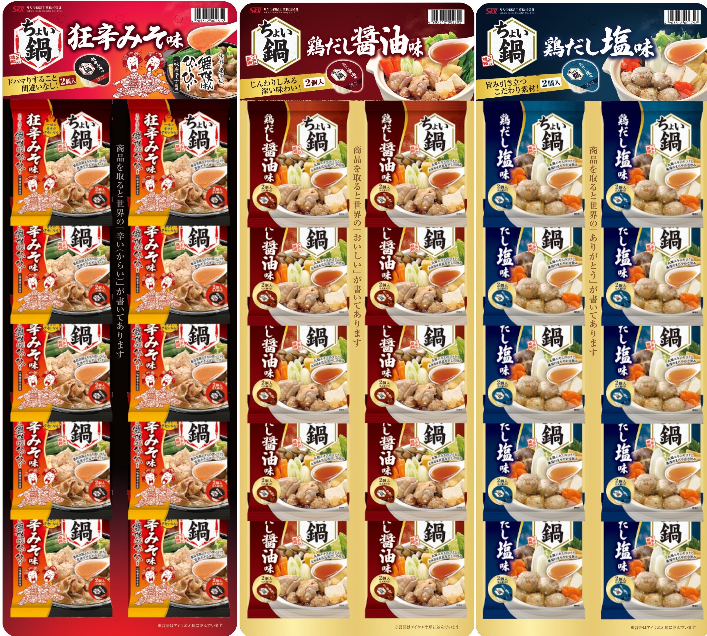 | 商品名 | ちょい鍋 狂辛みそ味 4個入/2個入 ちょい鍋 鶏だし醤油味 4個入/2個入 ちょい鍋 鶏だし塩味 4個入/2個入 |
