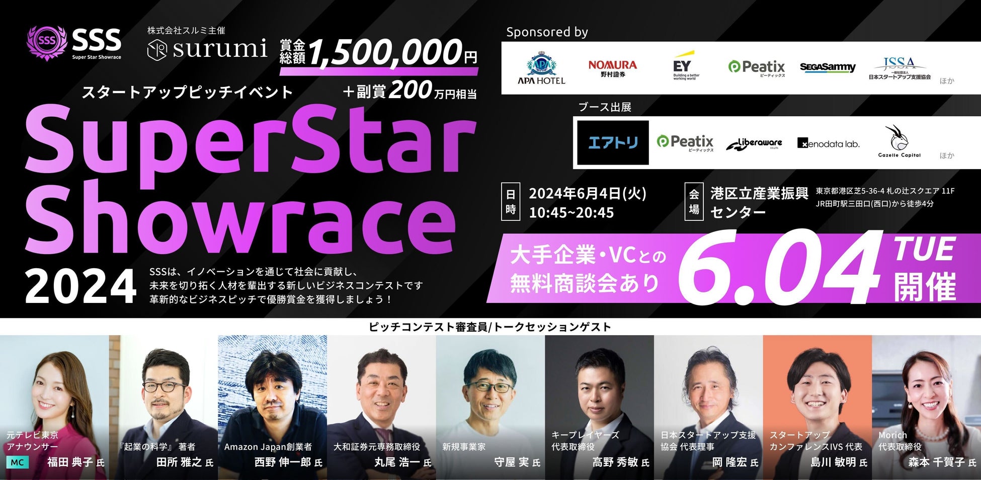 イベントを主催する株式会社スルミは、2020年に設立したスタートアップ企業です。代表の石塚つばさが日本大学在学中に起業し、現在は生成AIのプロダクト開発やコンサルティングおよび女性特化型AI/DX人材育成スクールの運営を行っています。石塚自身がスタートアップの立ち上げに挑戦する中で「若手起業家や女性起業家は、良いメンターに出会ったり、資金調達したり、協業先を見つけることが難しい」ということを実感しました。また、Z世代の起業家同士の繋がりも薄いと感じています。同じように苦労しているZ世代のスタートアップ企業のためになにかできないかと考えて企画したのが、今回の「Super Star Showrace (SSS/トリプルエス)2024」(イベント公式サイト:https://sss-events.jp/)です。