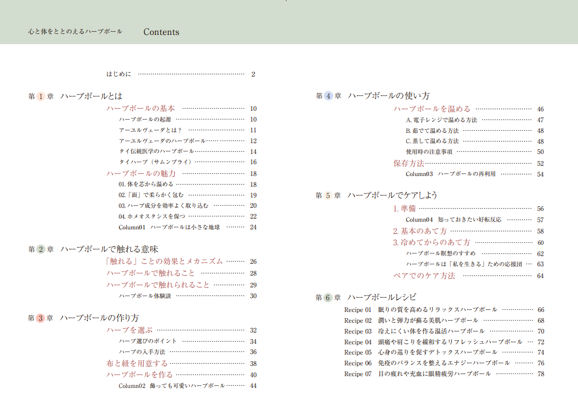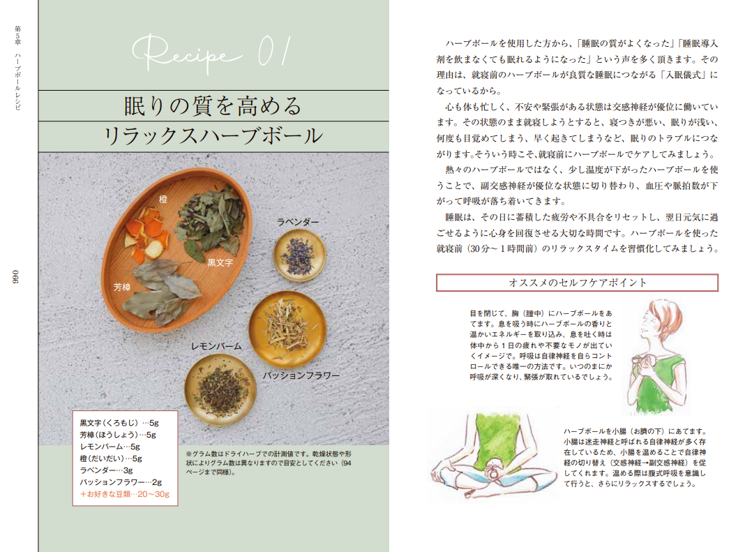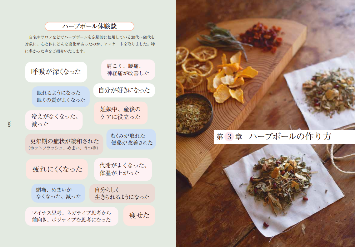 ほかにも、ハーブボールを使って自分の内側へと目を向ける「ハーブボール瞑想法」や作成に必要なハーブやハーブボールが購入できるショップ情報、レシピで使用するハーブ図鑑60種なども掲載されています。自分の心と体を整えて、元気に楽しく生きるためのアドバイスが満載な1冊です。