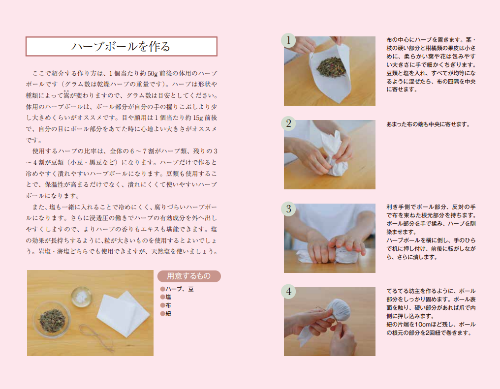 ハーブボールの医学的な歴史、様々な観点からの特徴や効果、17種類のレシピや作り方、セルフケア方法、60種類のハーブ図鑑など、これを読めば、ハーブボールについて知れて、作れて、セルフケアできます。使用シーンがイメージしやすいように、写真やイラストでハーブボールがもつ世界観を表現しています。
