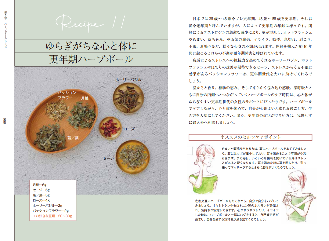 不眠、頭痛や目の疲れ、肌のたるみやくすみ、便秘やむくみなど、日々の暮らしの中でおこりがちなお悩みや、妊娠・出産・産後・更年期などのライフスタイルによる変化によって、心と体が乱れやすい大人世代。それぞれのお悩みに応じたハーブレシピと、オススメのセルフケアポイント、生き方の心得などを可愛いイラストで紹介しています。