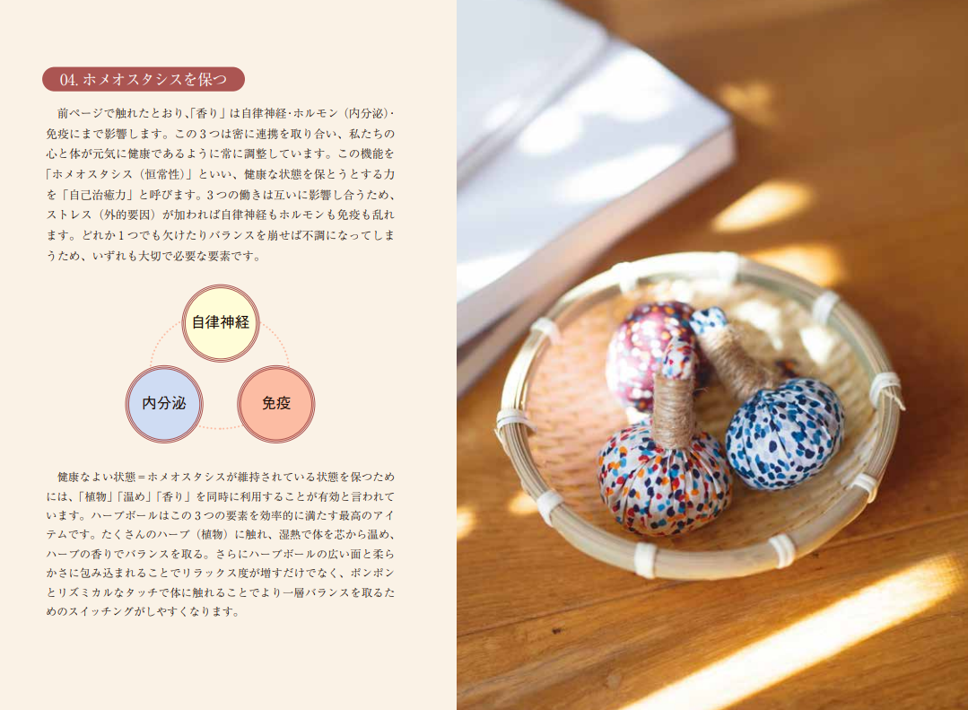 ハーブボールは、植物と温熱の力、そして香りと柔らかさ、独特なリズムによって、日々の暮らしの中で乱れやすい自律神経やホルモンのバランスを整える手助けをしてくれます。