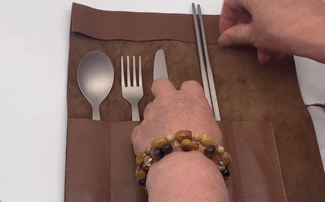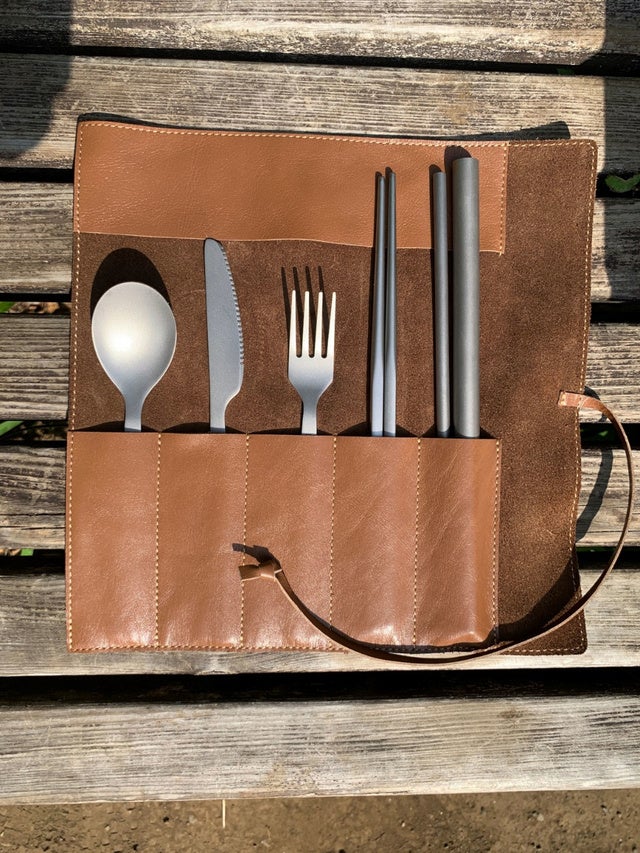 の手で仕上げたレザー製カトラリーケースと、丈夫で錆びず半永久的に使えるチタン製カトラリーを