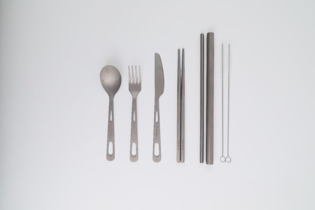 半永久的に使える純チタン製のカトラリーもセットでお届け。使い捨てゴミの削減に貢献できる。