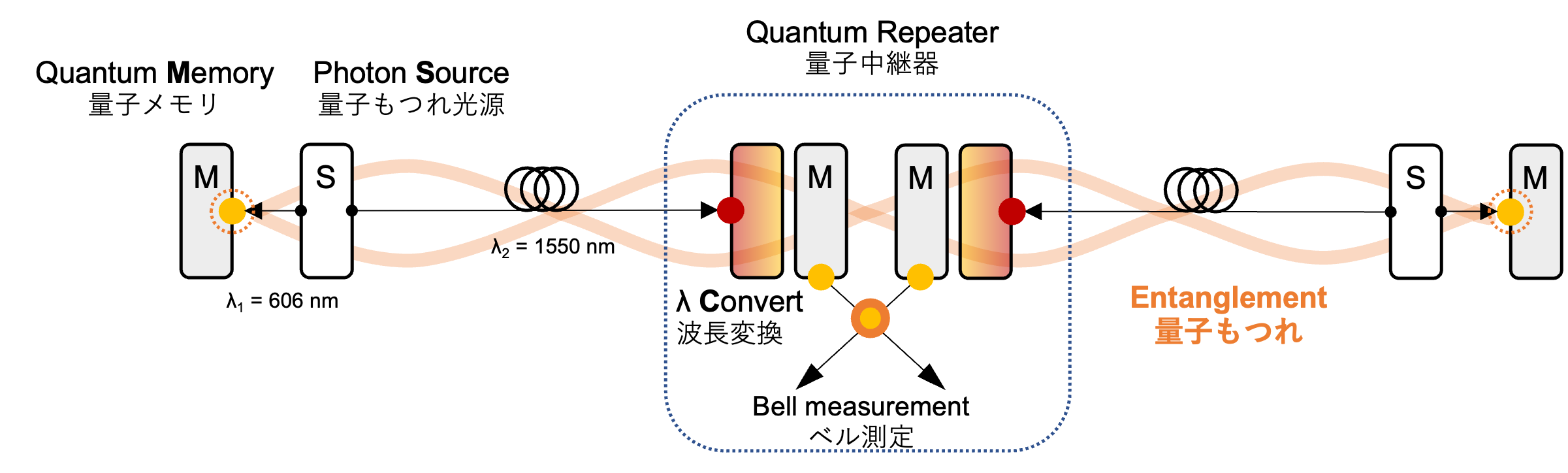 一方、長距離で安全な通信を行うためには中継が望ましく、量子インターネットを実現するためには、量子通信専用の『量子中継器』が必須であり、LQUOMは、量子中継器の開発に必要な基礎技術を保有しています。LQUOMは、量子もつれを用いた方式を採用した量子中継器の開発を通して、絶対安全な次世代ネットワークである量子インターネットの実用化を目指しています。