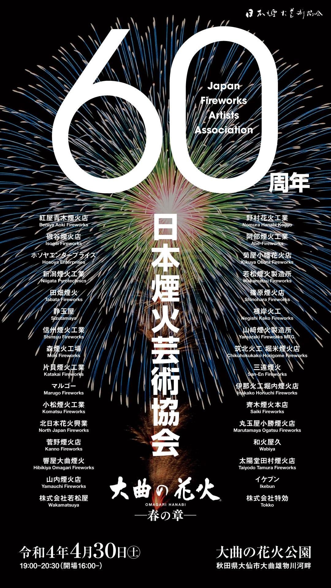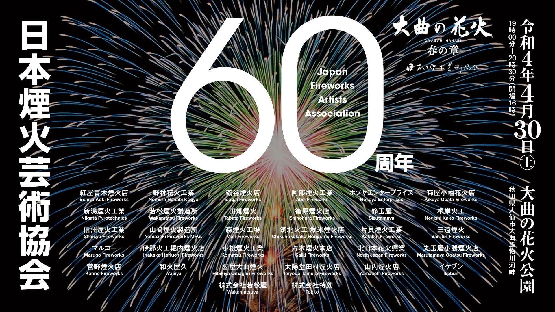 大曲商工会議所・大仙市(秋田県)が、2022年4月30日(土)に『大曲の花火 -春の章-』を開催します。今年は、「大曲の花火」にて日本煙火芸術協会60周年を祝し、内閣総理大臣賞など受賞の29社、地元業者4社が集結。「日本の花火」の技術の粋を結集した”百花繚乱”花火ショーをお楽しみください。