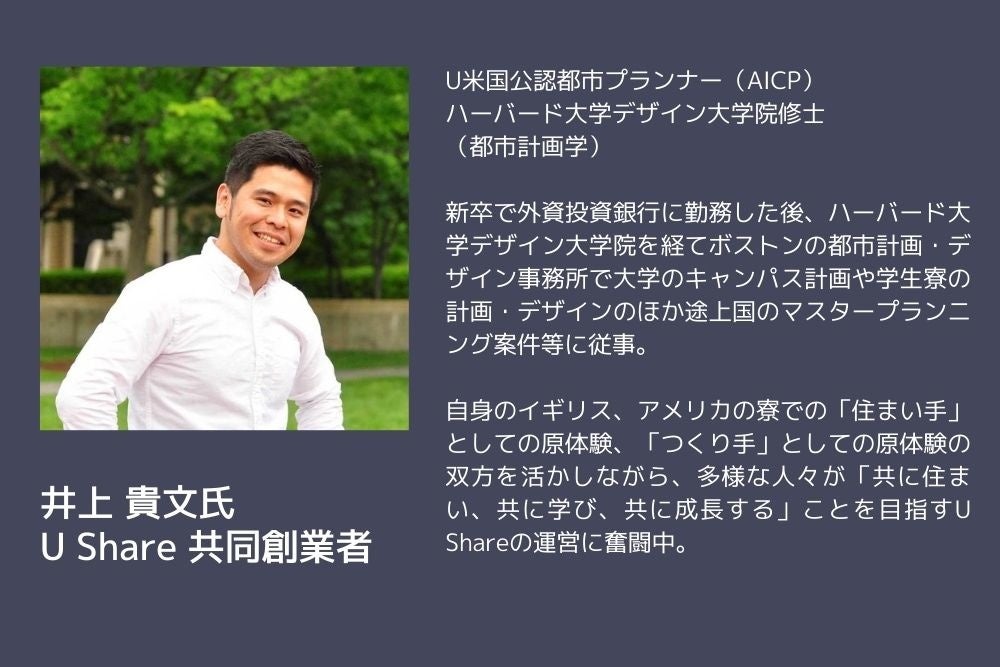 新卒で外資投資銀行に勤務した後、ハーバード大学デザイン大学院を経てボストンの都市計画・デザイン事務所で大学のキャンパス計画や学生寮の計画・デザインのほか途上国のマスタープランニング案件等に従事。自身のイギリス、アメリカの寮での「住まい手」としての原体験、「つくり手」としての原体験の双方を活かしながら、多様な人々が「共に住まい、共に学び、共に成長する」ことを目指すU Shareの運営に奮闘中。ミッションは「多様な人々が生き生きする都市空間、コミュニティづくり」。趣味はまち歩き、ラグビー観戦、ピアノ。