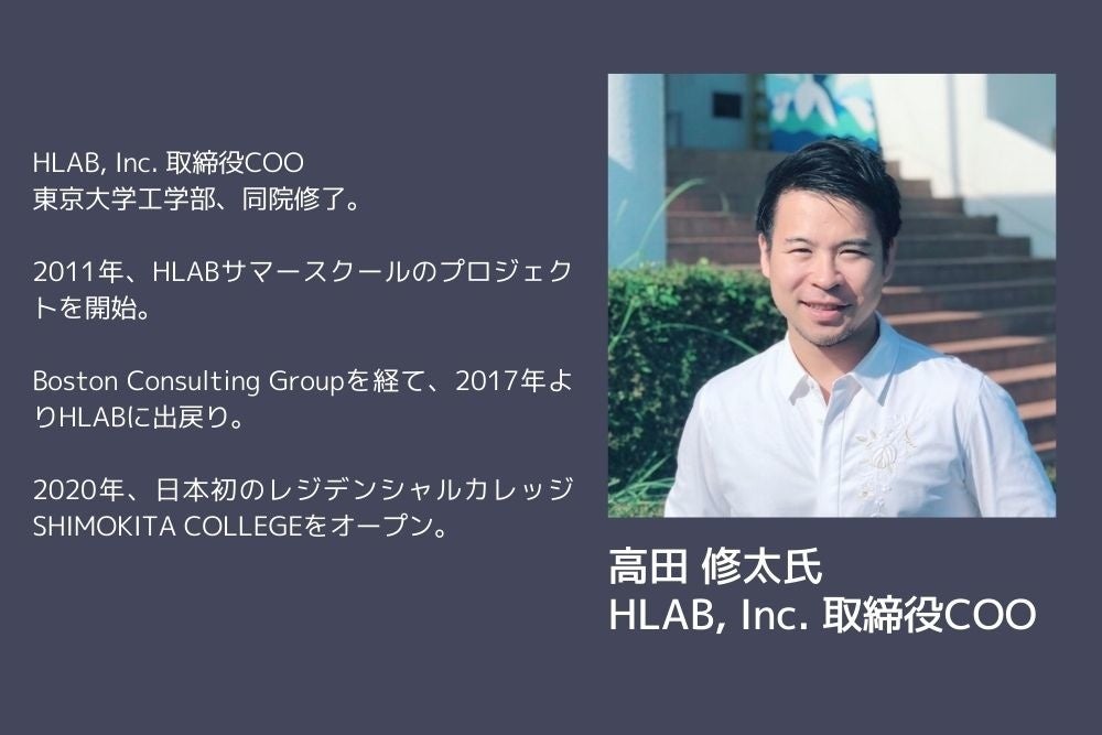 経歴:東京大学工学部、同院修了。2011年、HLABサマースクールのプロジェクトを開始。Boston Consulting Groupを経て、2017年よりHLABに出戻り。2020年、日本初のレジデンシャルカレッジ SHIMOKITA COLLEGEをオープン。