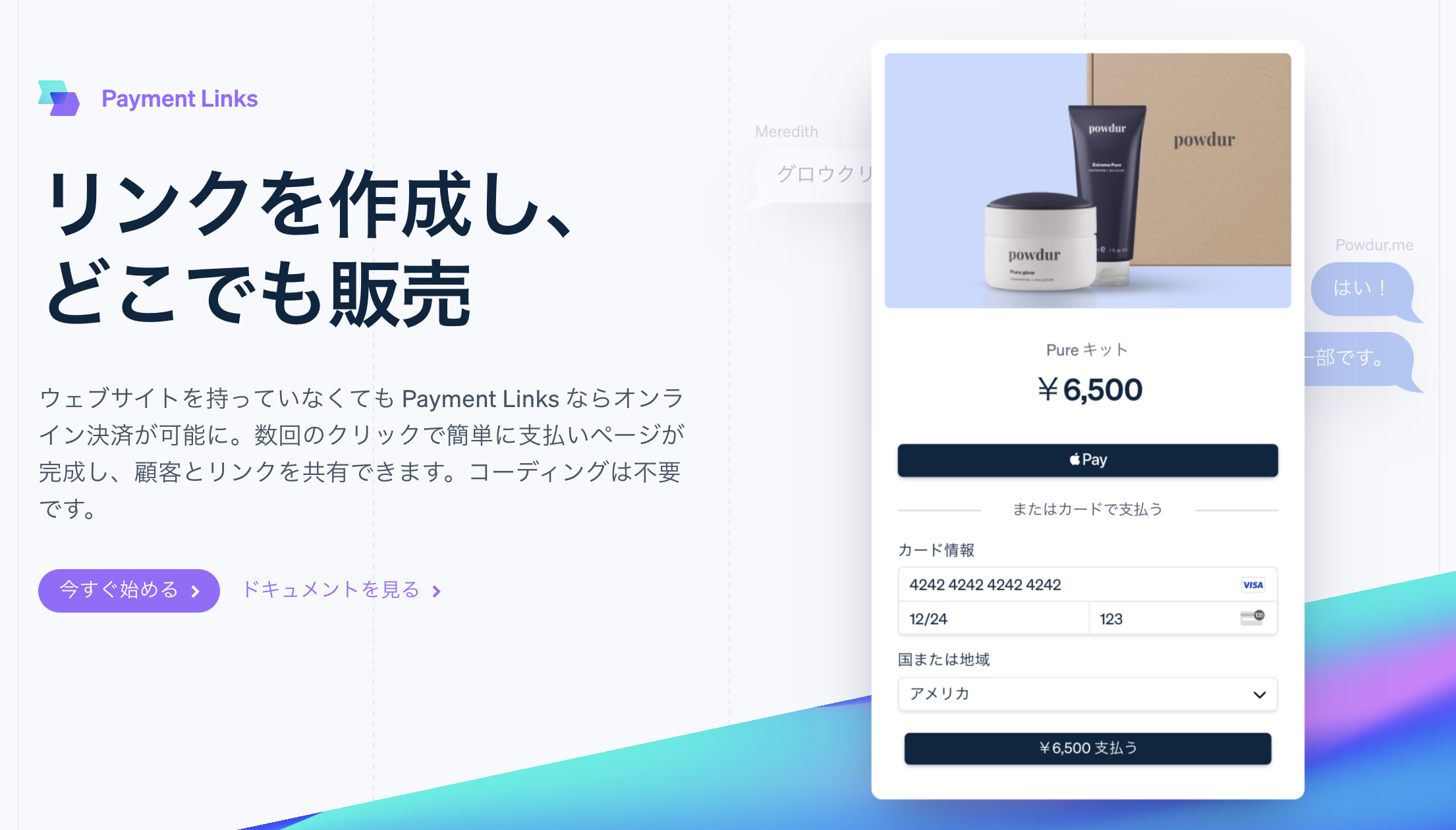 Payment Links を使えば、ウェブサイトを持っていなくても数回のクリックで決済ページを作成し、簡単に顧客と共有することができます。コードは必要ありません。40カ国以上、10万以上の企業が、ビジネスの立ち上げや新しいチャネルでの販売、価格設定のテストなどに Payment Links を利用しています。昨年 5 月に Payment Links の提供を開始した際、日本のユーザーが取引額において世界で第二位となった人気のサービスです。