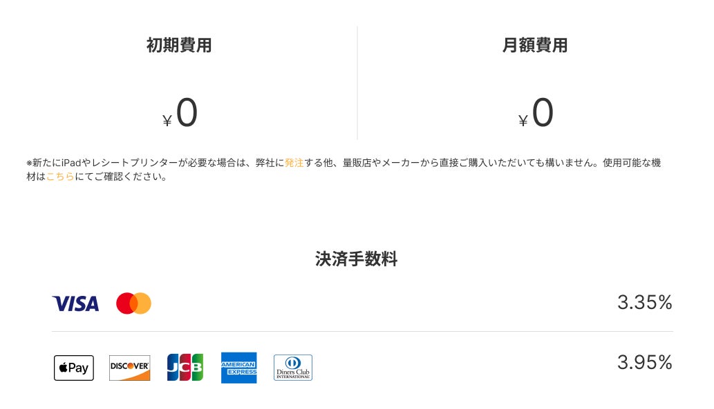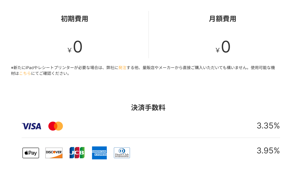 料金体系につきましては単純明瞭でございます。初期導入サポート及び月額使用料は無料です※。オーダーコードで決済された会計のみ、決済手数料が発生します。