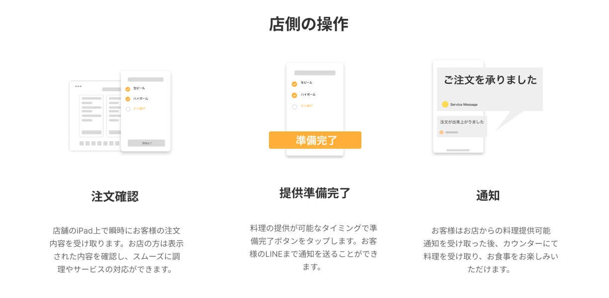 お客様が注文すると同時にスマホで決済、店舗側は料理の提供が可能なタイミングで準備完了ボタンをタップしますと、お客様にサービスメッセージの形で通知を送ることができます。
