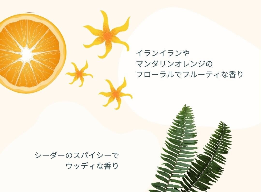 ・イランイラン、ビターオレンジ、アトラスシーダーなど、花が開花するときのしっとりとした自然の生命力を感じる香り