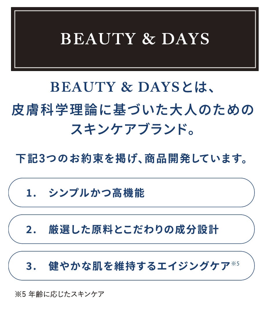 BEAUTY&DAYSは、大人のためのスキンケアブランドです。肌細胞の作用機序に無理がなく、効果性を重視した成分にこだわって厳選配合し、下記3つのお約束を掲げています。国境、性別を越えて、毎日を美しく生きたいと考える誰もが使いたくなるスキンケアを目指し、企画開発しております。