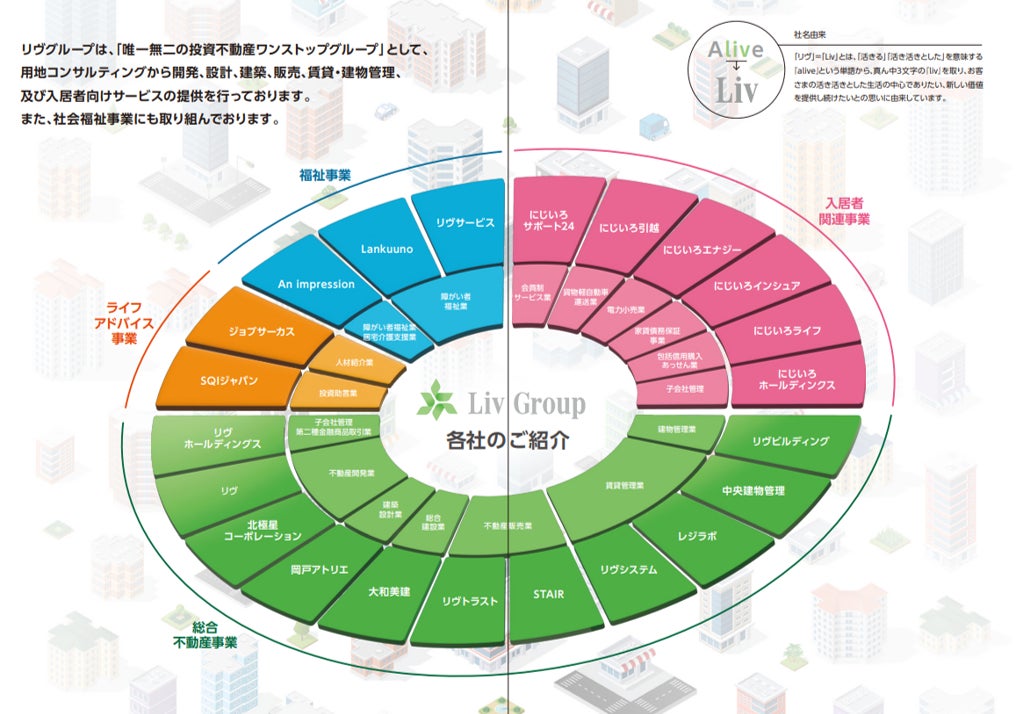 加えて、2021年に投資助言業を営む「株式会社SQIジャパン」をグループに迎え入れ、お客様へ分散投資の提案をワンストップで行うことが可能となり、2022年に土地活用コンサルティング業を営む「株式会社北極星コーポレーション」がリヴグループに参画し、リヴグループの仕入れ部門のポテンシャルが大幅に強化されました。そして2023年に競合他社と比べて極めて技術力が高い建築設計業を営む「株式会社岡戸アトリエ」、RCマンション建設を得意とする総合建設業を営む「株式会社大和美建」をグループ化し、リヴグループは"唯一無二な投資不動産ワンストップグループ"を標榜し、事業を展開しております。