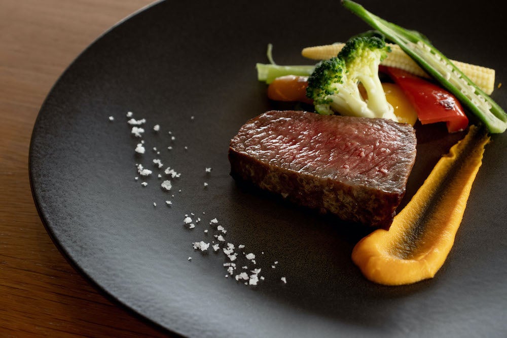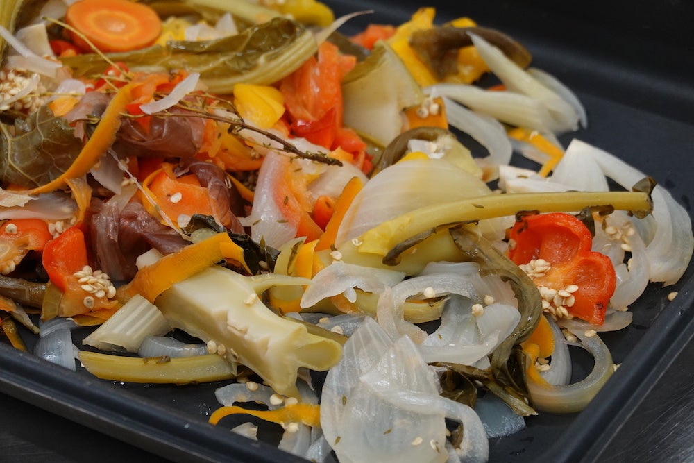 当館レストランでの調理の工程で出る野菜の皮や芯などの本来廃棄する部分からブイヨンをとり、その煮出した野菜を丁寧に処理、真空パックにして冷凍し、山形県遊佐町吹浦で汲み上げた鳥海山の伏流水とともに釜で炊き上げました。野菜の粒子が塩に混ざり合った野菜の旨みたっぷりのまろやかな風味の塩はサラダやグリル野菜によく合います。使う野菜はその時々の旬の野菜。野菜によって風味や味が変わります。