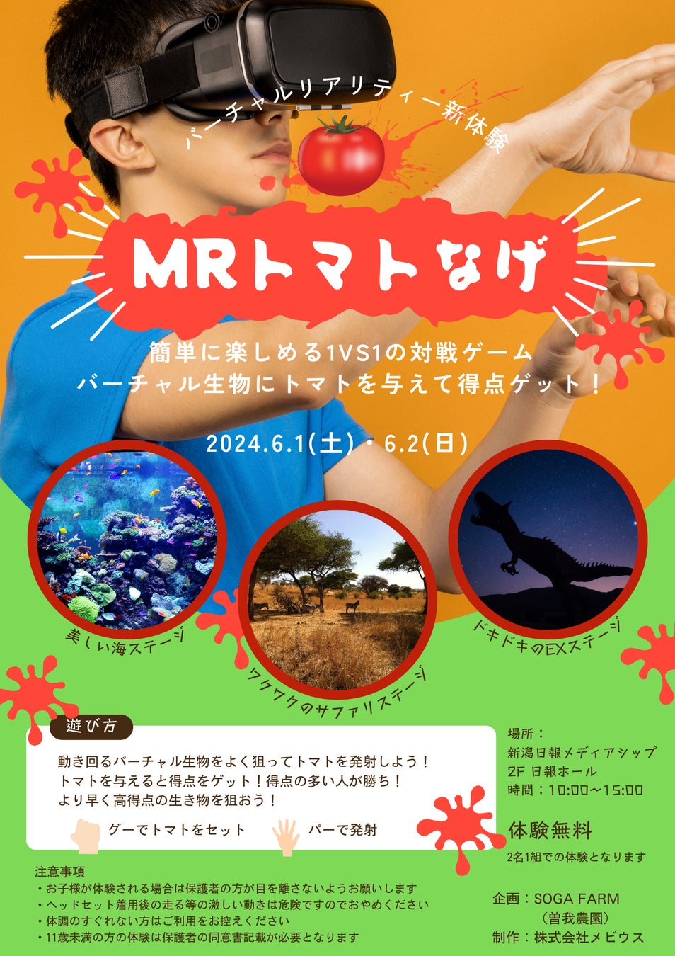 主催者である株式会社曽我農園(本社:新潟市北区、代表:曽我新一)はJA新潟市協賛で2024年6月1日(土)、2日(日)の2日間、新潟日報メディアシップ(共催)にて「にいがたMRとまと投げ」を開催します。これは(株)メビウス技術協力のもと、複合現実(MR)を使用したとまと投げゲームで、 2023年8月に新潟を襲った熱波被害からの復興を目的としています。開催当日は、曽我農園ブランド「越冬トマト」や「闇落ちとまと」、また被害地域であるJA新潟市北区産の豊栄(とよさか)、濁川(にごりかわ)トマトも販売。その他にフルーツトマトジュースの無料試飲、(株)NTT-ME(共催)による農業ICT技術展示会なども開催予定です。