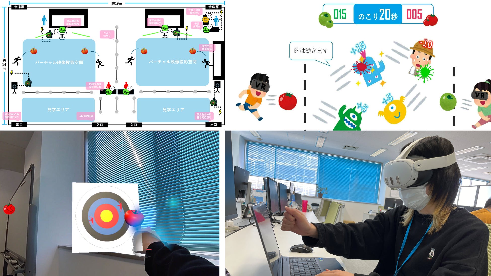 MR(複合現実)とは、現実世界と仮想世界を融合させた技術です。次世代のセンサー(ゴーグルなど)や画像テクノロジーを使用して、物理的なアイテムや環境と仮想的なアイテムや環境の両方とやり取りや操作を行います。 今回のイベントでは現実の部屋の中で、仮想のトマトを仮想のキャラクターに向かって投げ点数を競うゲーム性の強いものとなっています。またその状況をスクリーンに映し出し、第三者が見ても楽しめるようになっています。