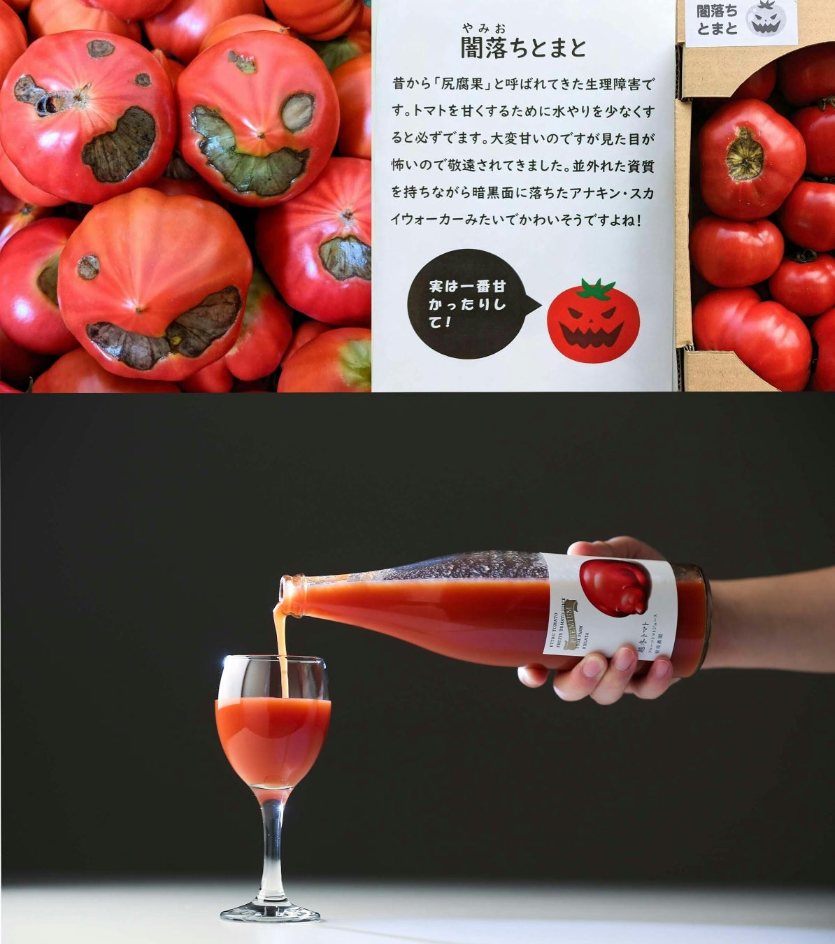 (株)曽我農園は新潟市北区で直売所を営むトマト農家です。当農園の「越冬トマト」は野菜ソムリエトマト選手権において食味日本一を2年連続で受賞し、現在は越冬トマトを原料にしたジュース、ケチャップの販売もしております。近年はSNSを通じて規格外品トマトの情報を発信。2021年には、本来廃棄して捨ててしまう「尻腐れトマト」(実は一番甘い)を「闇落ちとまと」と命名することで正規品をしのぐ人気を獲得しています。