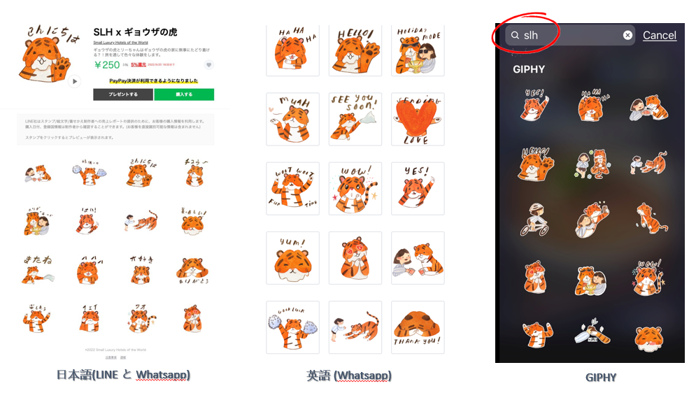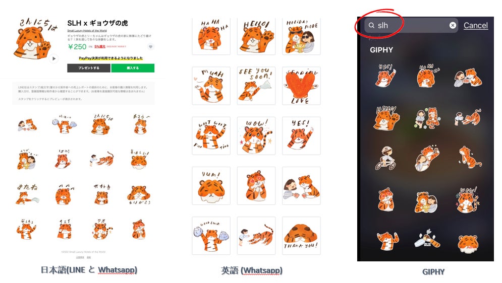 志を同じくする人との会話を後押しするために、SLHは「旅」がテーマの16個のステッカーをGIPHY(ギッフィー;キーワード「slh」にてアクセス可能)で公開し、Instagram Stories(インスタグラムストーリー)で使用できるようにいたしました。似たようなトラベルステッカーをLINE(ライン)、Whatsapp(ワッツアップ;無料)、WeChat(ウィーチャット;無料)でも提供いたします。