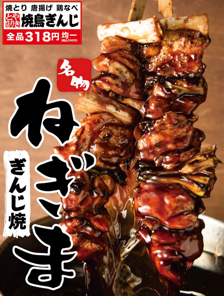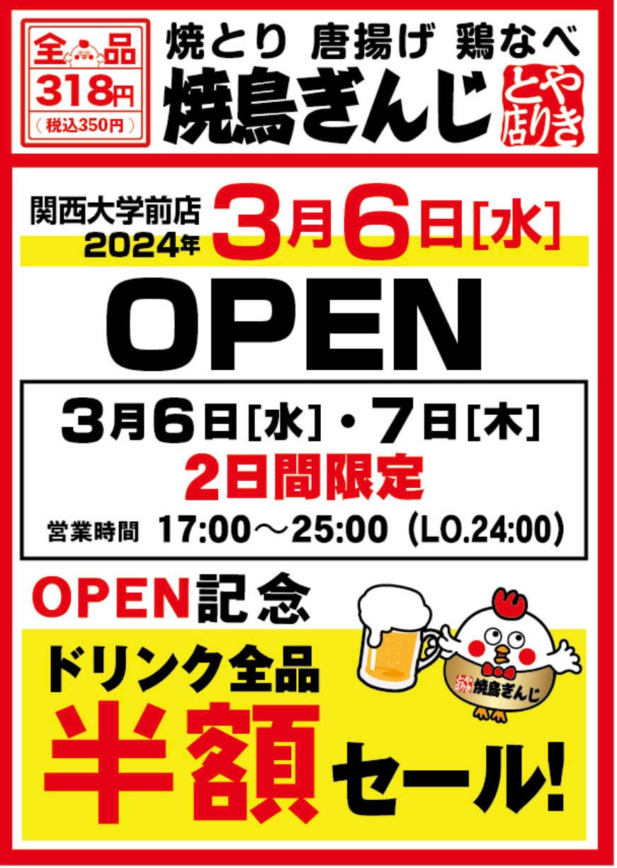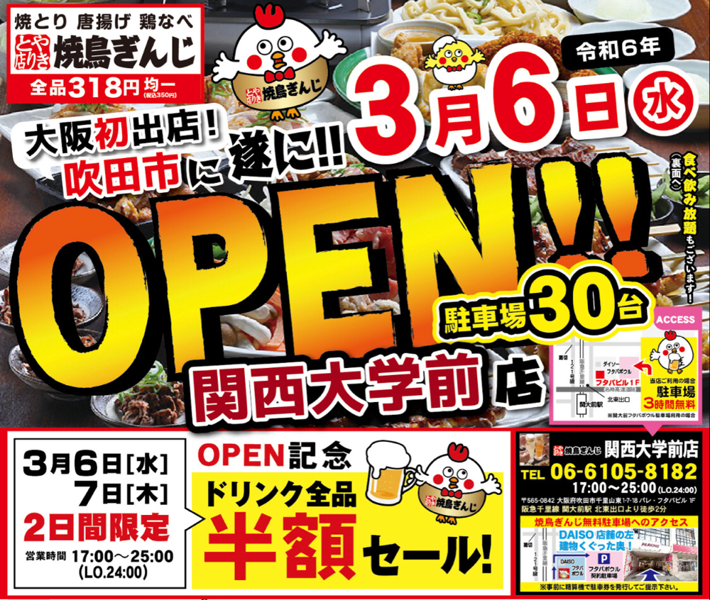 『大阪初出店』京都で愛される大人気の焼鳥屋『焼鳥ぎんじ』全品318円均一(税別)☆大阪・関西大学前店が3月6日(水)OPEN!「2日間限定」ドリンク全品半額159円(税込175円)キャンペーンを開催!