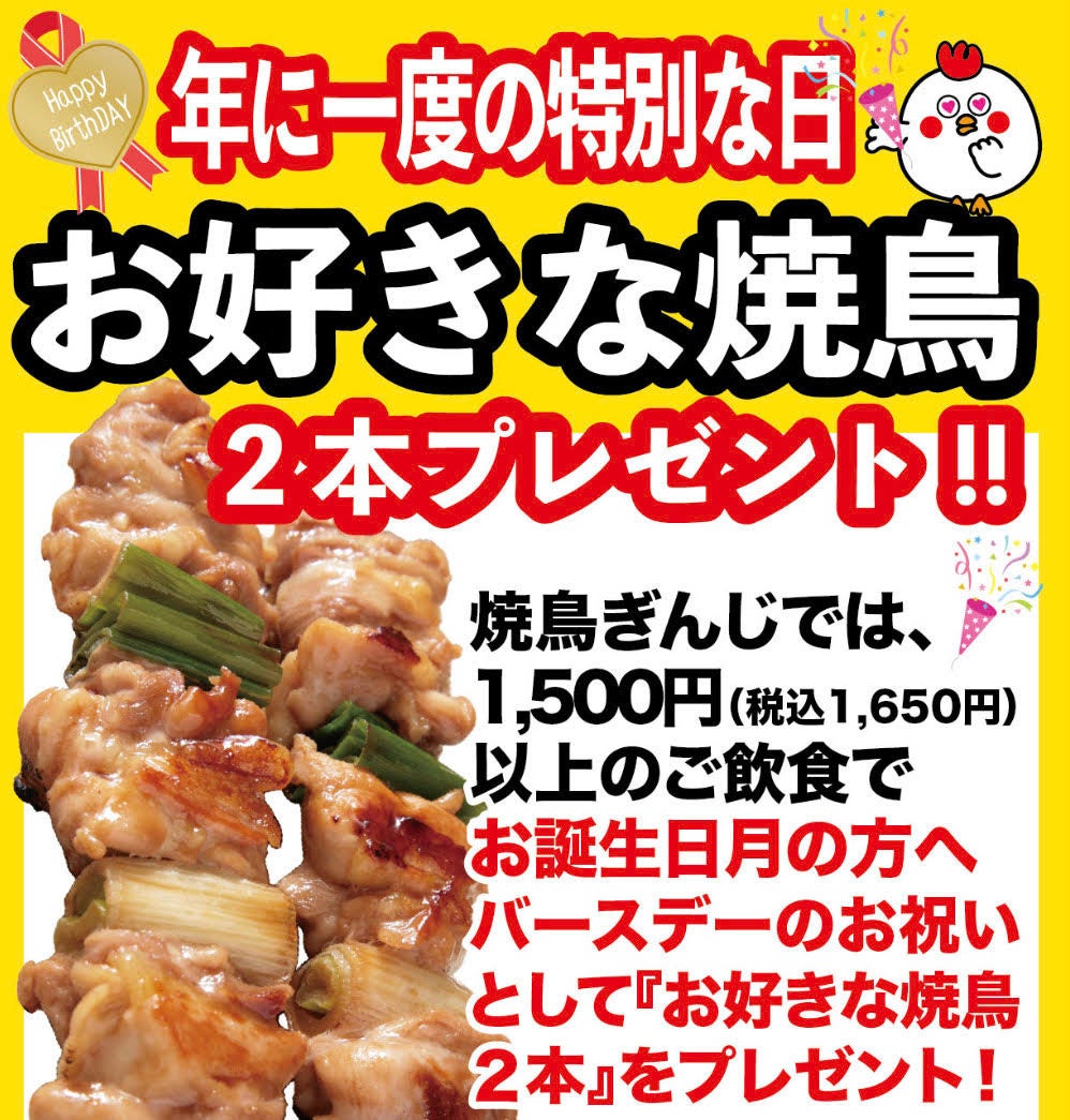 ぎんじではお誕生日月にお好きな焼鳥をプレゼントしています!
