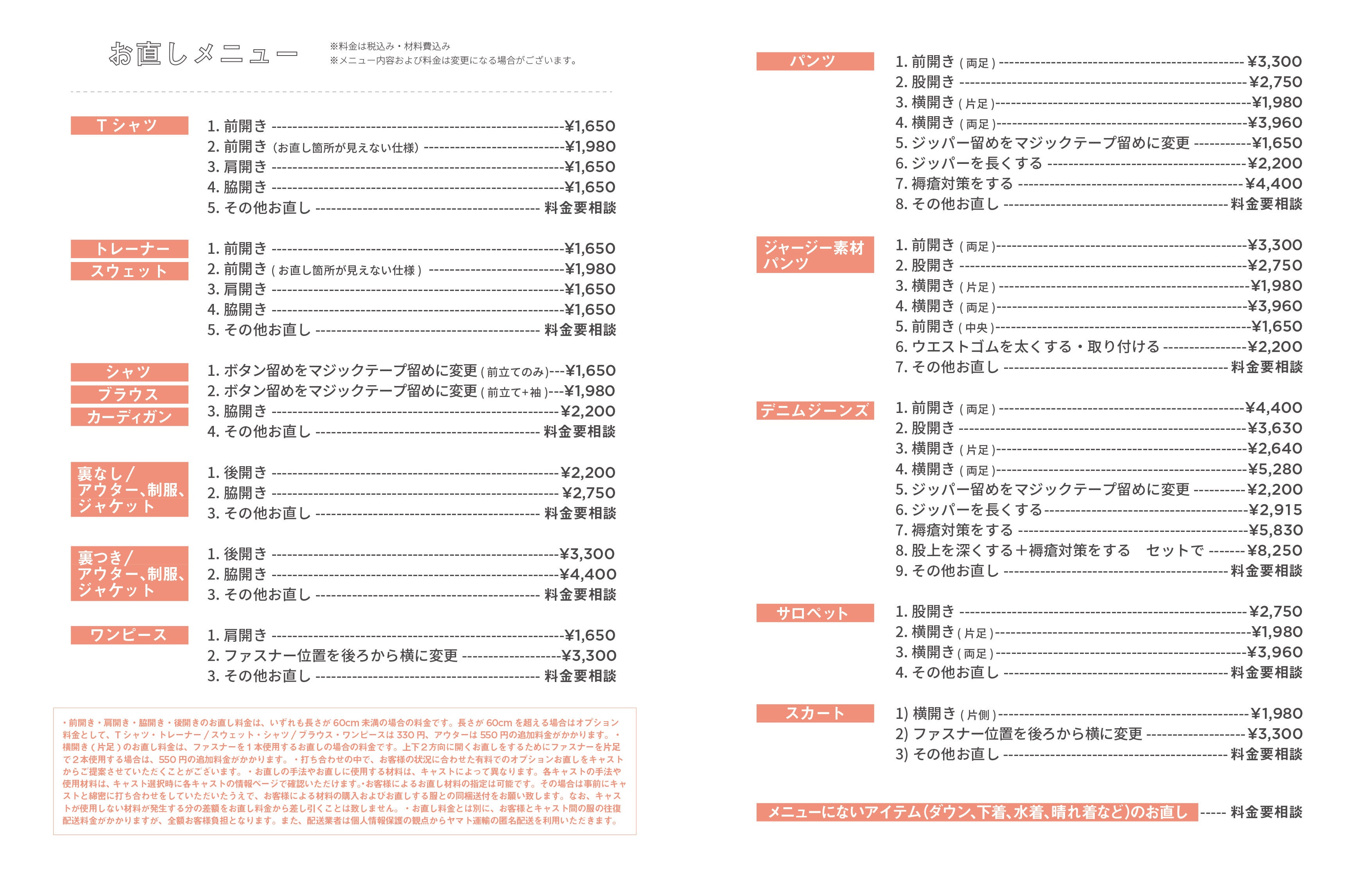 (注)配送料金は通常通りの料金となります。また、お直し作業開始からお返しまで3週間前後かかりますので余裕を持って注文ください。