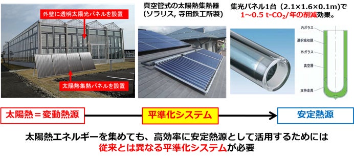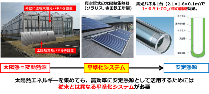 その中で、敷地内の「農業ハウス」では、太陽熱エネルギーの利用を検討してまいりました。しかしながら、変動熱源である太陽熱を効率よく安定熱源に平準化することは従来のシステムでは難しい現状にありました。