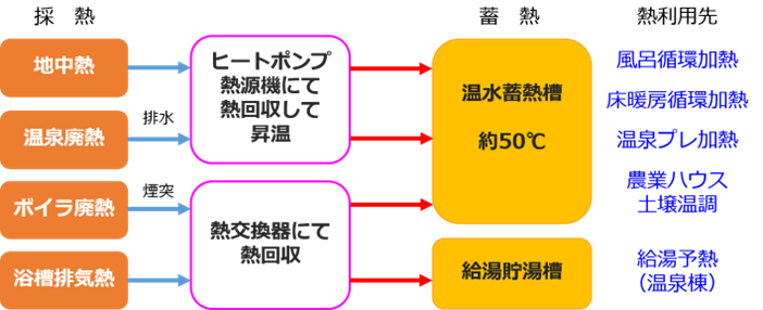 アクアイグニス仙台は、省エネ性やCO₂排出量の削減に寄与することを目的としており、地中熱・温泉排熱・ボイラ廃熱・浴槽排気熱から熱を回収し,各設備にて利用するシステムを構築・導入しております。