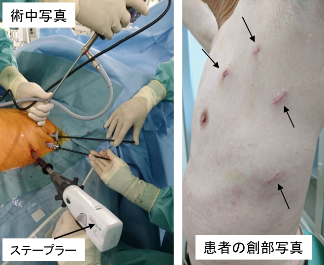 - 胸腔鏡手術に熟達した外科医であれば脇の下の3~4カ所の小さな刺し傷から短時間で出血なく完遂できる超低侵襲治療