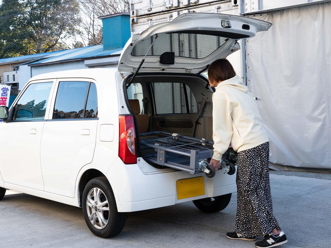 通常のカゴ台車であれば、片面しかフレームを折り畳むことができませんが、天使のカゴ台車Lightは両面折り畳み式。コンパクトだからこそ、車高の低い車や軽自動車にも、女性一人で荷下ろしが可能。利用場所がさらに広がります。