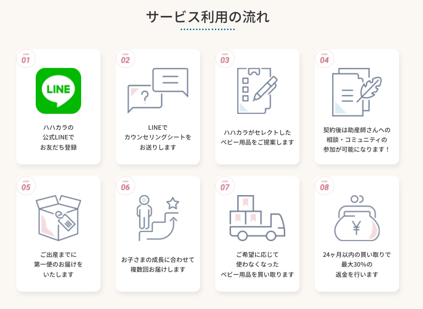 「ハハカラ」は、働き盛りの忙しいご家庭の産前産後をサポートするための15品目を定額でまとめて購入できるベビー用品一括調達代行サービスです。お子さまの成長に合わせてベビー用品を発送し、そして不要になったタイミングで再買い取りします。情報収集・判断・購入・処分の手間をなくすことができ、産前産後のご家庭の負担を軽減します。ユーザーのこだわりに合わせて、商品の選択や新品または手頃なお下がり品の選択をすることが可能なこともポイントです。また、核家族化、ご近所付き合いの減少などを要因とした母親の社会的孤立や情報不足が懸念される社会課題に対応すべく、ハハカラユーザー特典としてLINEによる気軽な助産師の相談サービスとユーザーが参加できるハハカラコミュニティも提供しています。