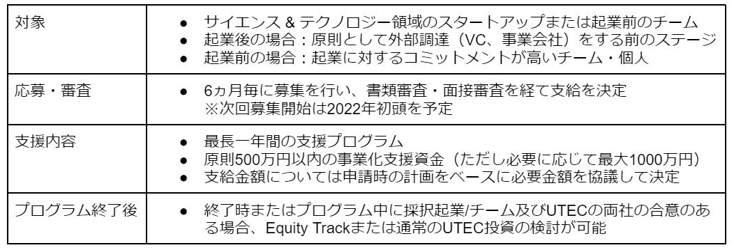 なお、第2期となる「Grant Track」の募集は、2022年初頭を予定しており、正式発表は、UTEC公式HP (https://www.ut-ec.co.jp/) 及び、UFP公式HP(https://ufp.jp/)、UTEC公式Twitter (https://twitter.com/UTEC_official) で行う予定です。