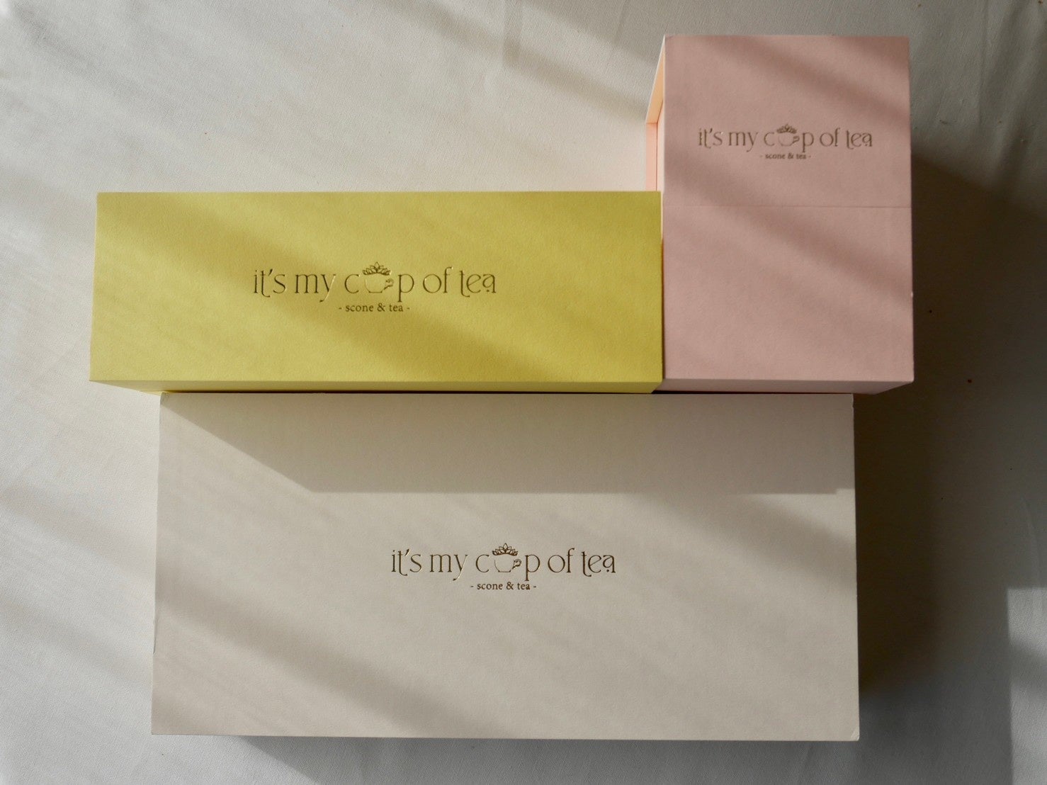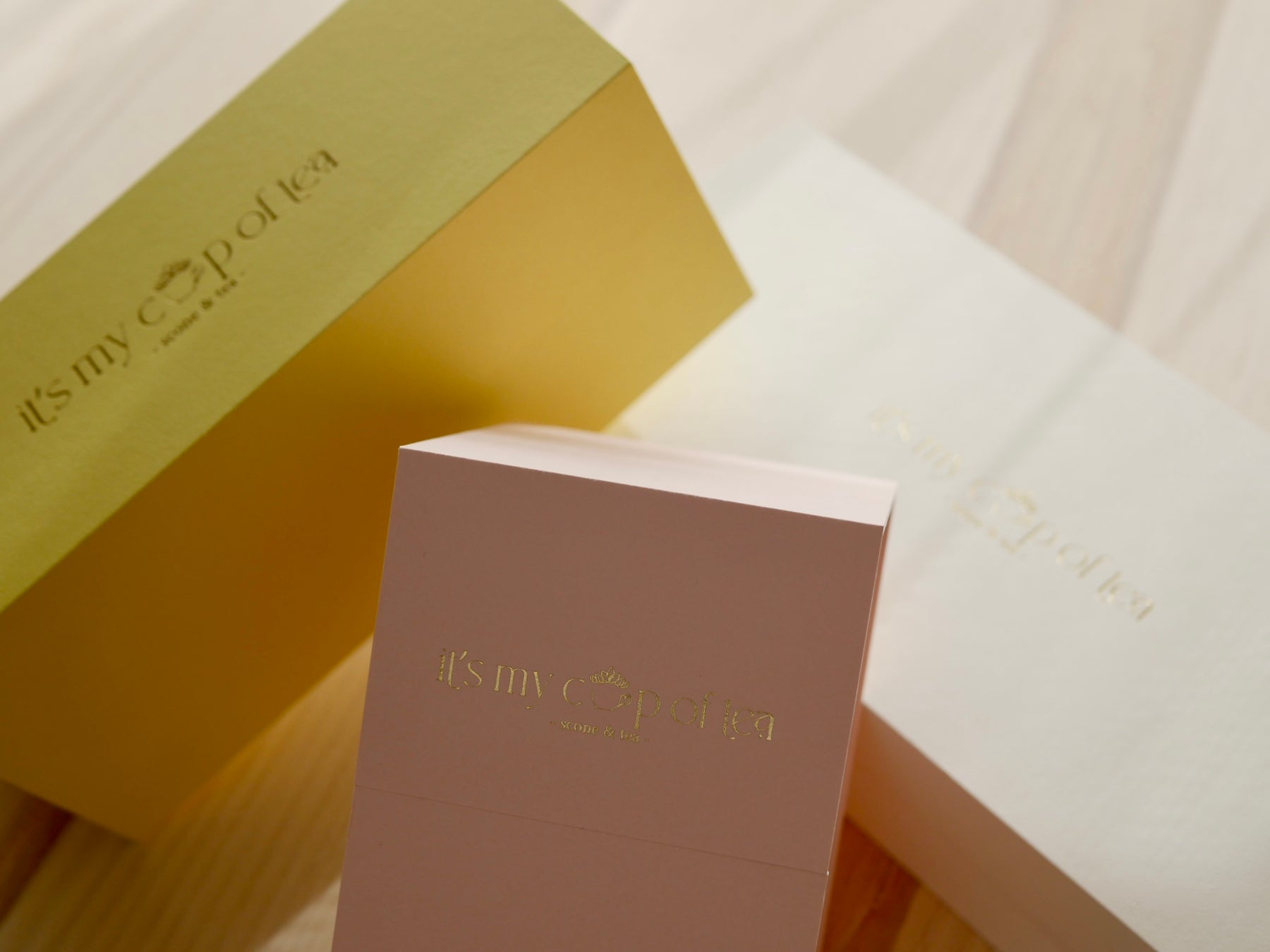it's my cup of teaのパッケージは、ブランドカラーのピンクとイエロー、ホワイトのカラー展開にゴールドの箔押しがされたブランドメッセージが刻まれており、ギフトとして喜ばれる高級感溢れるデザインに仕上がっています。
