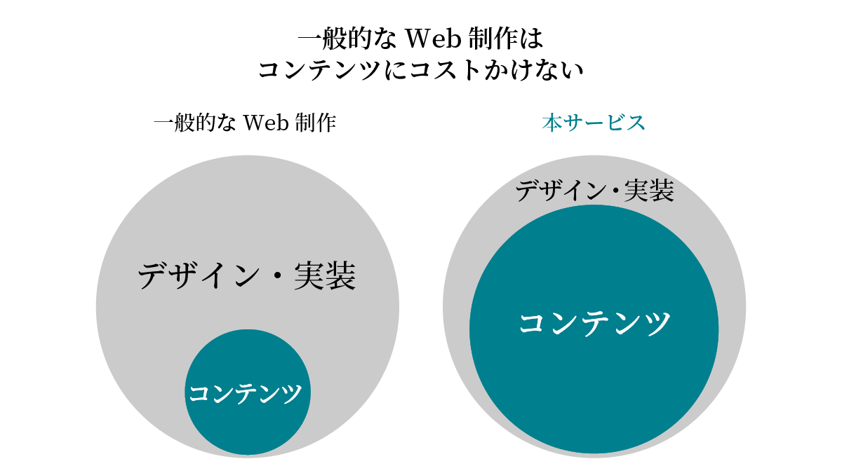本サービスでは、コンテンツに注力し、代わりに「デザイン」「(Webや紙媒体への)実装」領域には、多くのリソースを割きません。例えばWeb制作は、テンプレートの利用等で必要十分なクオリティを確保し、コストパフォーマンスの高いサービスを実現しました。