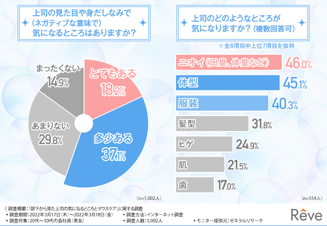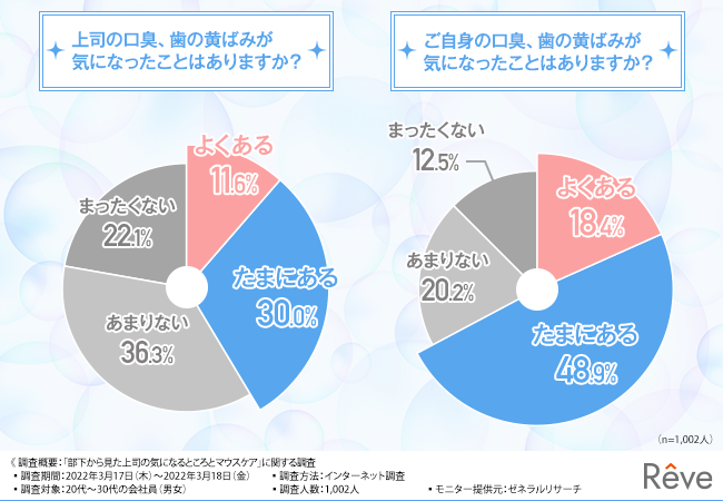 そこで今回、ハイブリッド歯磨きジェル「Rêve(レーヴ)」(https://reve.iris.fit/)を販売するイーリス株式会社は、20代~30代の会社員(男女)を対象に、「部下から見た上司の気になるところとマウスケア」に関する調査を実施しました。