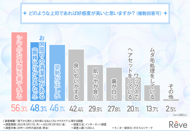 そこで、「どのような上司であれば好感度が高いと思いますか?(複数回答可)」と質問したところ、『シワのない服を着ている(56.3%)』と回答した方が最も多く、次いで『お口周りの清潔感がある(不精ひげがない など)(48.3%)』『姿勢が正しい(46.1%)』と続きました。